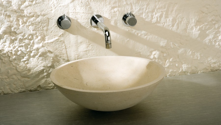 A substantial bowl produced from a solid piece of stone. Featured here in a crema marfil limestone with a matt finish. Available in angel white marble, white carrara marble, and absolute black granite.