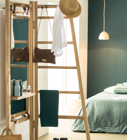 Valet with mirror, shelf, robe hooks, and double ladder storage