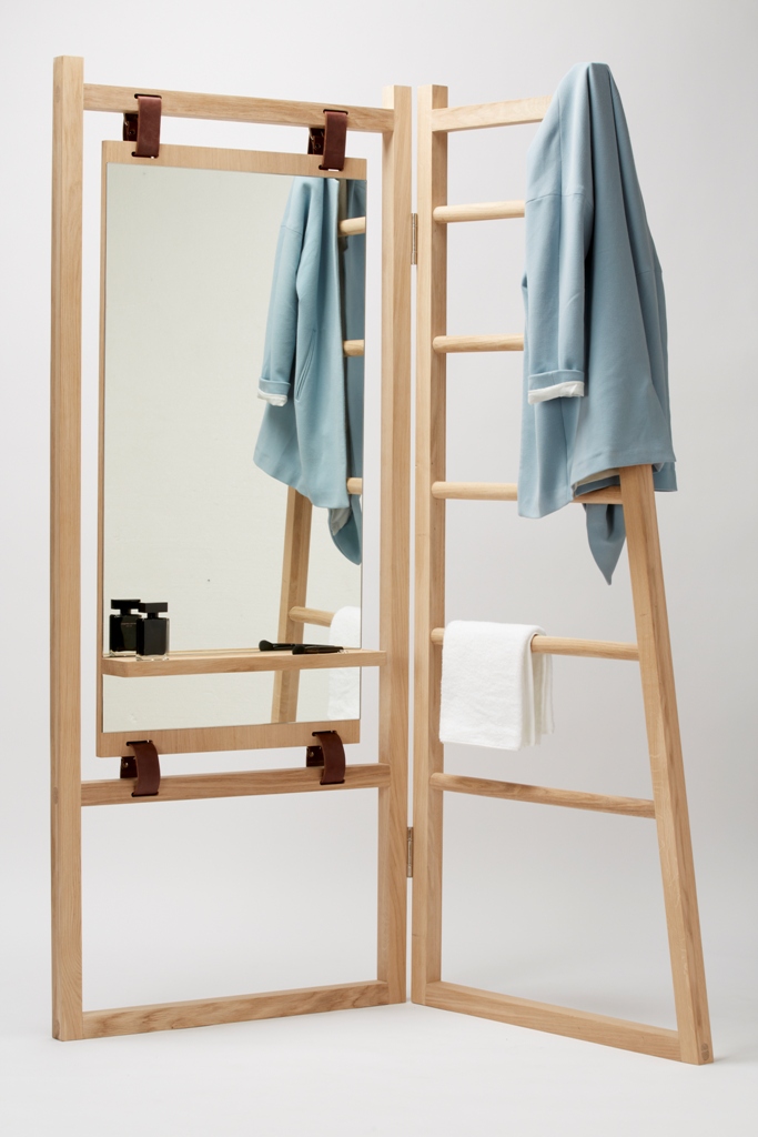 On one side a mirror with integrated solid wood shelf, a place to leave your valuables or the contents of your pockets. On the reverse side are robe hooks for hanging clothes, laundry or accessories. Made entirely from solid oak with the mirror and robe hooks suspended by leather straps complementing virtually any interior design.