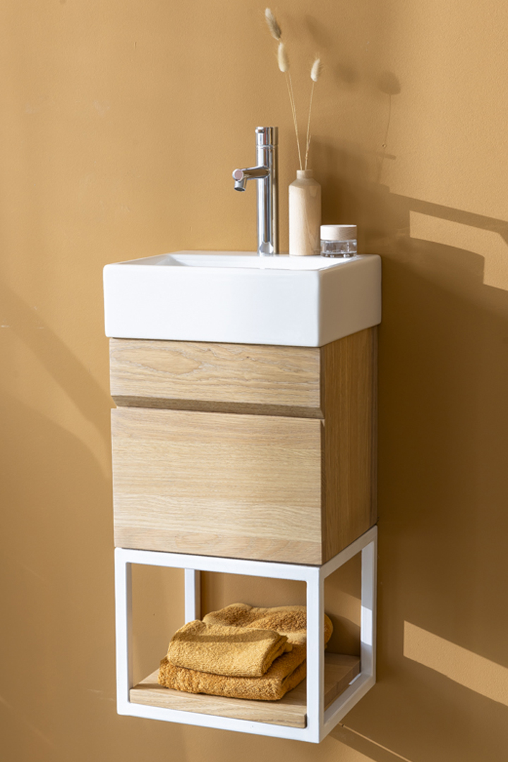 Complete with a white metal frame with shelf and white basin