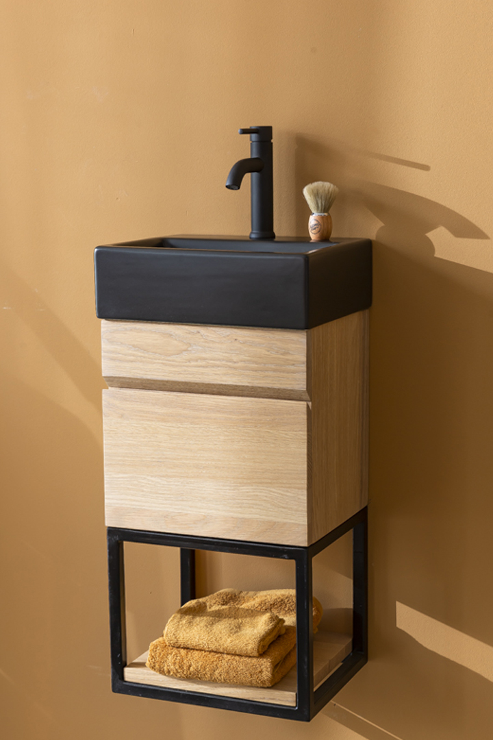 Complete with a black metal frame with shelf and matt black basin
