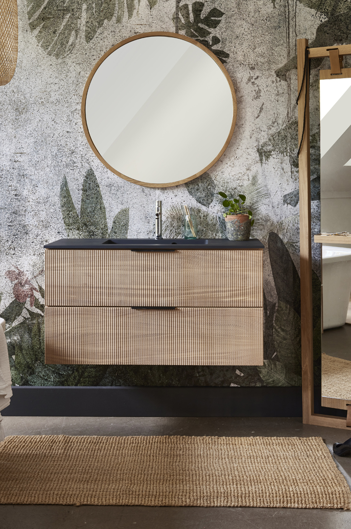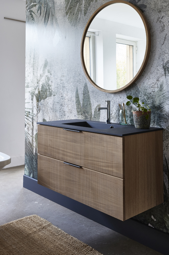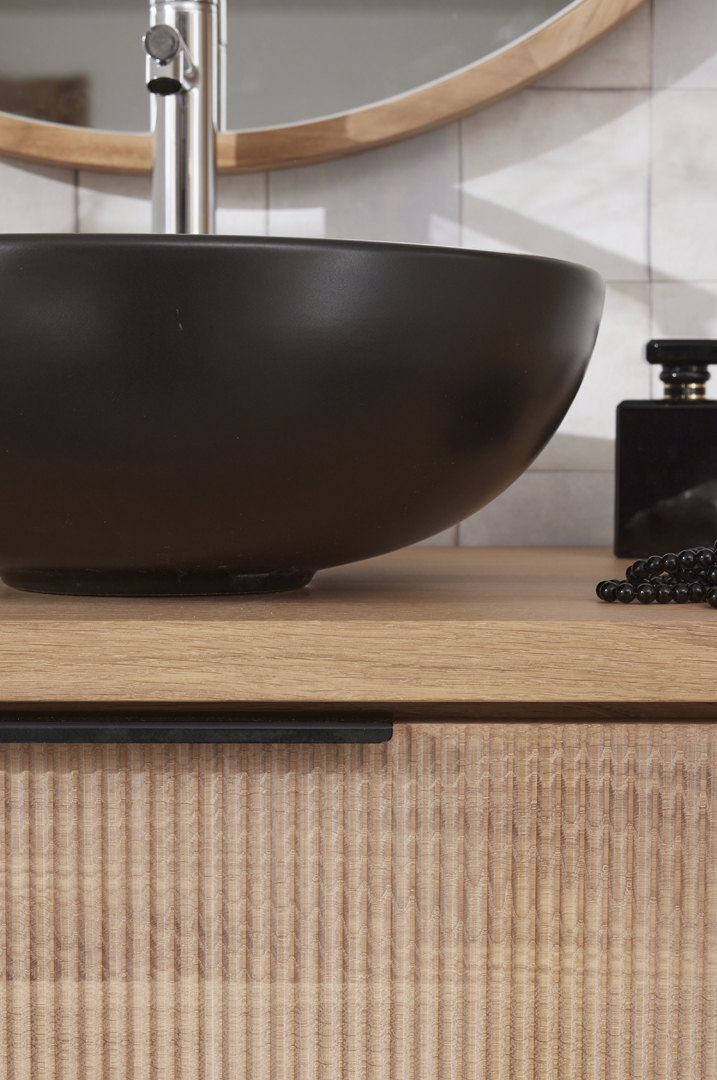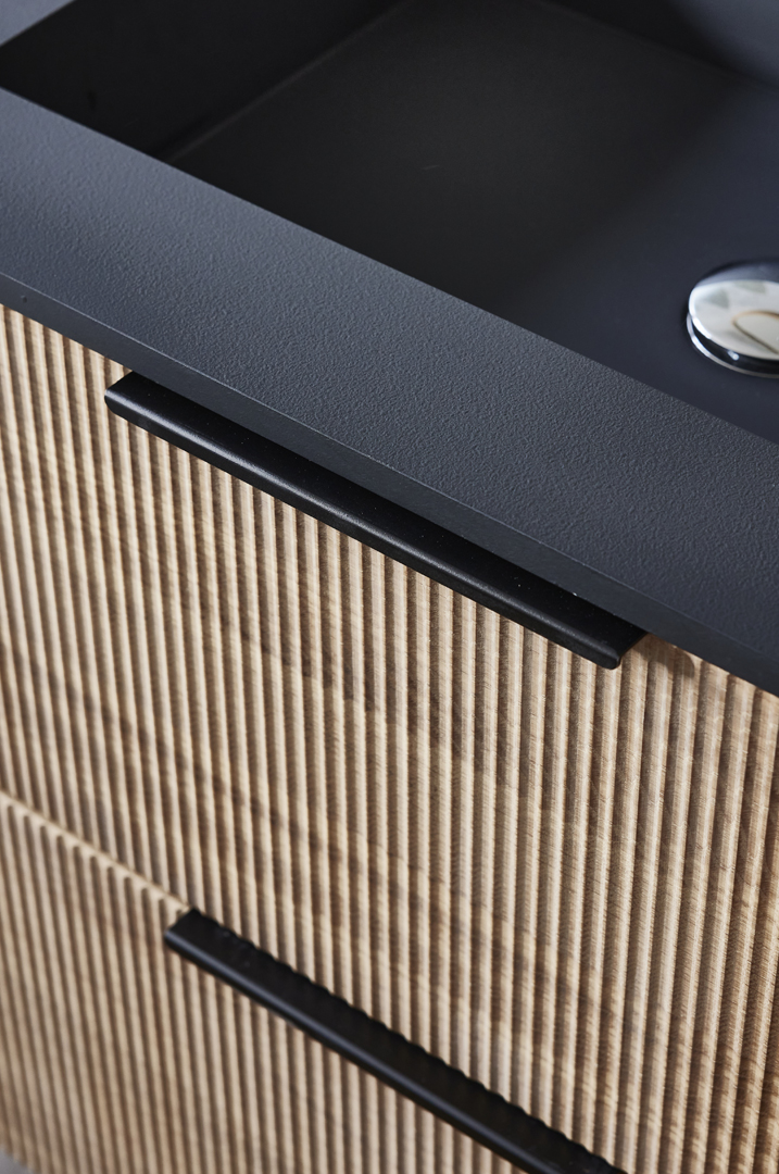 The 3 sizes can be supplied with either 3 options of ceramic and solid surface basins or alternatively with a countertop in oak, stone or ceramic for use with a countertop basin of your choice. There is also the option of stainless or matt black drawer handles.